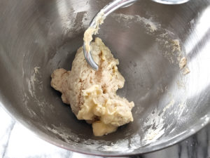 2:ミキサーにドゥーフックを付けて、低速で生地がまとまったら、室温に戻すかレンジで10秒加熱したマーガリンを加えて混ぜましょう。