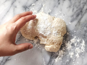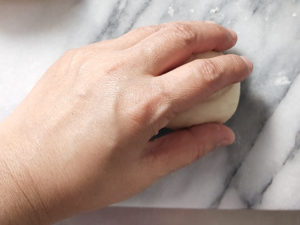 4:台の上に生地を取り出し、生地がべたついているようなら、強力粉を少量(分量外)まぶして、生地を捏ねます。