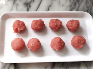 8:生地の発酵をかけている間に、桜あんで、1個24~25gくらいのあん玉を8個作りましょう。