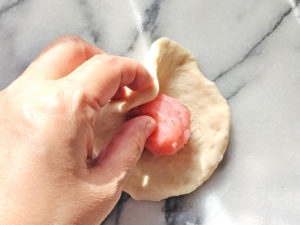 13:中央に桜餡を乗せ、周りの生地を引っ張ってきて包みましょう。