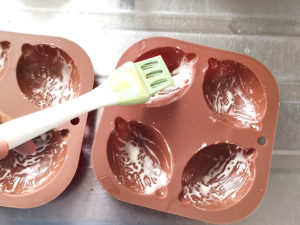 ![]() 9:ケーキを型から外し、粗熱を取っておきましょう。 10:その間に、沸騰寸前のお湯でチョコとチョコ用油を湯せんにかけて溶かします。 11:ケーキの膨らんでいる面にそっと漬けて、チョコの面を上にして冷やしましょう。 |