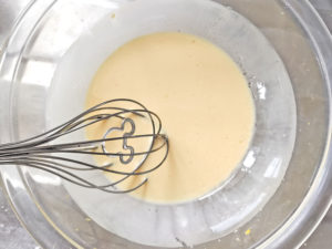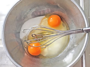 ![]() 1:ボールは2種用意し、1つ目に卵と砂糖を入れて泡立てます。 2:白っぽくもったりとし、泡立て器を持ち上げると、数秒跡が残ればOK。 |