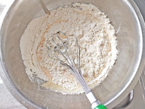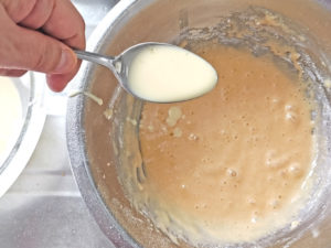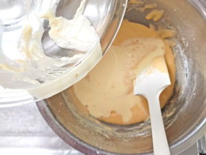 ![]() 7:粉のボールに、耐熱ボールのマーガリン液を全て加え、ゴムベラで練らないように、筋が消えるまで、しっかり目に混ぜましょう。 |