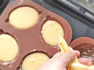 ![]() 8:絞り袋に生地を詰め、先を切って口金代わりにして、型に絞り入れましょう。 |