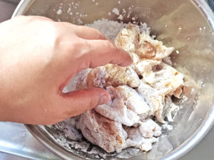 ![]() 5:15分経ったら、水気を少し切るようにして、揚げる分ずつ、片栗粉を薄くまぶします。 |