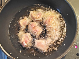 ![]() 6:180度くらいの油で、鍋にたっぷり目に肉を入れましょう。 |