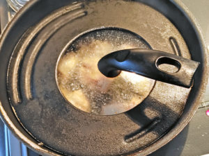 ![]() 7:蓋をして、片面3~4分くらい蒸し揚げにします。 ※肉が大きいので、蓋をした方がしっかりと火が通ります。 |