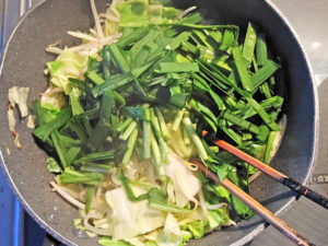 ![]() 6:野菜のフライパンにニラも加え、ニラがしんなりするまで炒めたら、具材はOK。 |