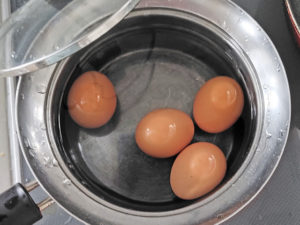 ![]() 1:鍋に水を多めに入れ、水から卵をゆでて、固ゆでのゆで卵を作ります。 2:出来たら、冷水に漬け、殻をむいておきましょう。 |