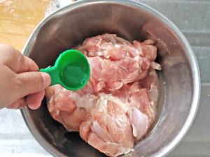 ![]() 4:鶏肉をボールに入れ、酒をまぶして、手で揉みこみましょう。 |