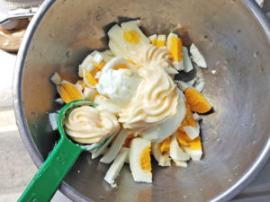![]() 5:別のボールにゆで卵の粗みじん切りとマヨネーズ、玉ねぎのみじん切りを加えてタルタルソースを作ります。 |
