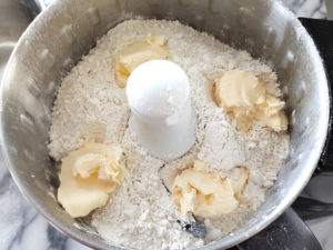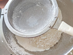 1:薄力粉、ベーキングパウダー、砂糖をふるいにかけ、フードプロセッサーのボールに入れます。