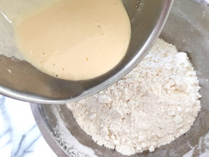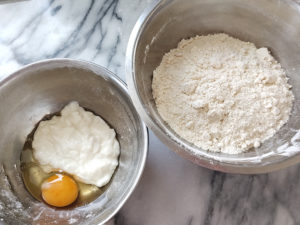 5:薄力粉のボールに、ヨーグルト液を混ぜ、柔らかく、かつベタベタしない生地を作ります。