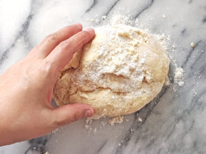 6:軽く強力粉(分量外)で台の上に打ち粉をして、生地を数秒間捏ね、生地を滑らかにしましょう。
