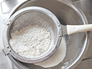 ![]() 1:薄力粉、重曹、砂糖をふるいにかけて、ボールに入れます。 |