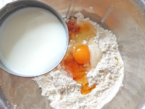 ![]() 3:窪みを作り、卵、牛乳、メープルシロップ、レモン汁を加え、泡立て器で、生地が滑らかになるまで混ぜます。 ![]() ※混ぜすぎるとスコーンが固くなるので注意! |
