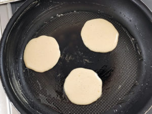 ![]() 4:1回につき、大1ずつの生地をフライパンに流し入れ、上面が固まり始め、下面が黄金色になるまで約1~2分焼きましょう。 5:生地をひっくり返し、反対側も黄金色になるまで、さらに1~2分焼きます。 |