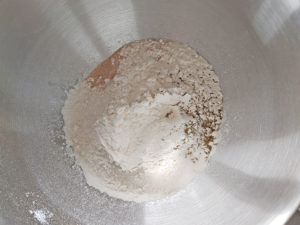 ![]() 1:スタンドミキサーのボールに、強力粉、イースト、塩、ドライバジルを入れてよく混ぜます。 |