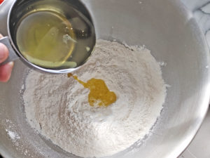 ![]() 2:中央に窪みを作り、オリーブオイルとぬるま湯を加えましょう。 3:ミキサーにドゥーフックを装着し、低速で柔らかくべたつかない生地を作ります。 ※硬すぎるなら大1の水を加え、柔らかすぎるなら薄力粉を少しずつ加えると良いです。 |