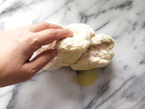 ![]() 4:台の上と片手に少量のオリーブオイル(分量外)をとり、柔らかく滑らかになるまで10分ほど捏ねましょう。 |