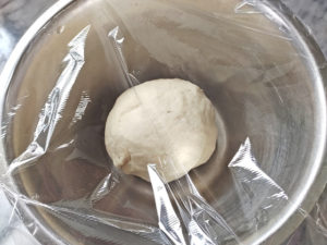![]() 5:生地を大きめのボールに入れ直し、ラップをかぶせて、冷蔵庫で一晩置きます。 ※すぐに使う場合は、ラップをして35度で1時間ほど置き、2倍に膨らめばOKです。 |