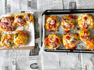 ![]() 7:生地を二等分し、薄く伸ばして成形(型で抜くのも楽しい)したら、お好きなソース(ピザ用ソースなど)、好きな具材など乗せ、最後にピザ用チーズを散らします。 |
