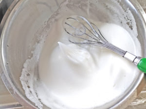 ![]() 1:卵は卵白と卵黄に分けてボールに入れます。 2:卵白に砂糖をひとつまみ加えて泡立て始め、クリーム状になったら、残りの砂糖を二回に分けて加え泡立てましょう。 3:ピンと角が立つまで。 (メレンゲ) |