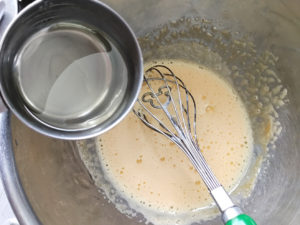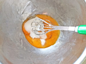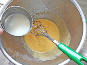 ![]() 5:卵黄の方に牛乳を少しずつ加えながら、その都度良く混ぜましょう。 |