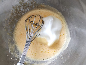 ![]() 7:卵黄のボールにメレンゲをゴムベラでひとすくい入れ、良く混ぜましょう。 |