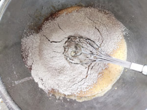 ![]() 8:薄力粉とベーキングパウダー、ココアパウダーを一緒に振るい入れ、粉っぽさが消えるまで混ぜましょう。 |