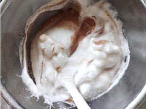 ![]() 9:メレンゲを全量加え、ゴムベラに持ち替えてさっくりと練らないように混ぜます。 |