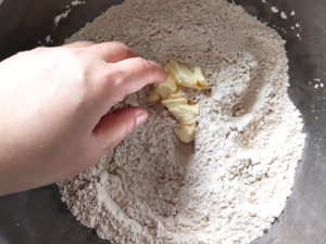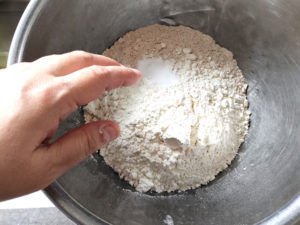 ![]() 1:大きめのボールに、全粒粉、薄力粉、重曹、塩を入れて手でよく混ぜます。 |