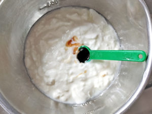 ![]() 3:さらに、別のボールにヨーグルトと黒蜜を入れて混ぜた混合液を作ります。 |