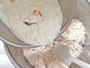 ![]() 4:ヨーグルトの混合液を小麦粉のボールに加えて、ゴムベラで優しく混ぜましょう。 |