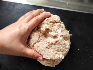 ![]() 5:生地を軽く打ち粉(分量外)をした台の上に取り出し、3~4回捏ねて、ごつごつしたボール状にまとめます。 |