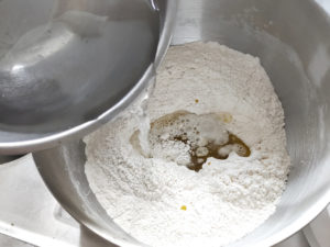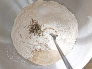 ![]() 1:スタンドミキサーのボールに、強力粉、イースト、塩、ローズマリーを加え、しっかりと全体を混ぜます。 |