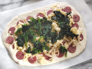 スタンドミキサーを使うと、生地を捏ねる時間が大幅短縮です。今回は大きめのフォカッチャに、ほうれん草とチーズとサラミをサンドしてみたら、大好評だったレシピです。