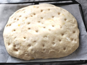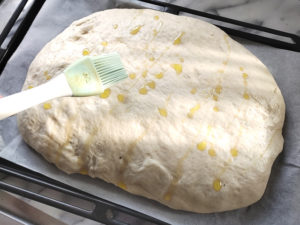 ![]() 11:フォカッチャの表面に軽くオリーブオイル(分量外)を塗りましょう。 |