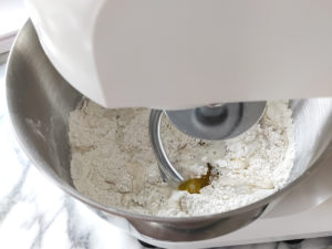 ![]() 2:オリーブオイルとぬるま湯も加え、ドゥーフックを取り付けたら、生地が柔らかくなるまでしっかりと捏ねましょう。 |