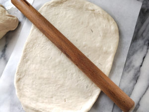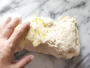 ![]() 6:発酵した生地にパンチをして空気を抜き、軽くオリーブオイル(分量外)を塗った台に置いたら、捏ねずに半分に割りましょう。 |