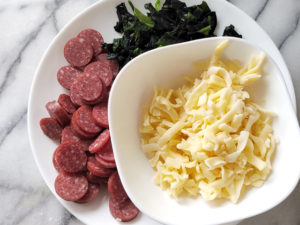 ![]() 5:生地を発酵させている間に、具材を食べやすい大きさに切ります。 ※サラミは薄い輪切りに、ほうれん草は解凍、チーズはそのまま。 |