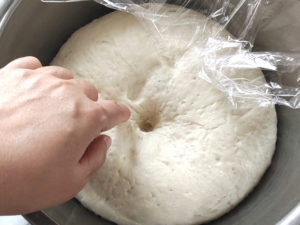 ![]() 12:指で生地を軽く押し、穴ぼこのように、デコボコした感じになったらOK。 |