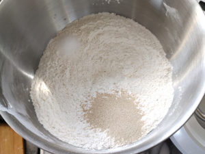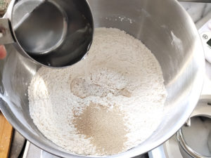 ![]() 3:ボールの片側に塩、反対側にイーストを加え、250㏄の水を加えたら、片手の指で粉類を混ぜます。 |