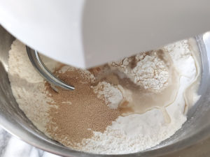 ![]() 4:生地に残りの水も加えたら、ドゥーフックをつけたミキサーで、5~10分捏ねて、滑らかな生地を作りましょう。 |