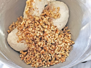 ![]() 5:刻んだくるみも生地に加えて、なじむまでミキサーで混ぜます。 |