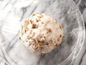 ![]() 6:軽くオリーブオイル(分量外)を塗った別のボールに生地を入れ、ラップで覆い、30度のオーブンで90分置き、2倍以上に膨らませましょう。 |