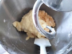 ![]() 2:牛乳と卵を加え、ドゥーフックを付けたミキサーで、低速で2分ほど捏ねましょう。 3:粉っぽさがなくなったら、中速に変更して、6~8分ほど混ぜ、弾力があり柔らかい生地を作ります。 |