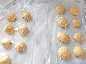 ![]() 6:軽く強力粉で打ち粉(分量外)をした台の上に取り出し、数回捏ねましょう。 7:生地を16等分し、少し平らにします。 8:ラズベリーを8個分、チョコも8個に分けて包み、ボール状にしましょう。 |