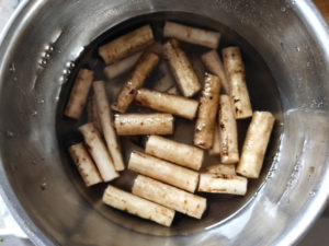 ![]() 2:ごぼうは皮を包丁でこそげて、5cm長さに切りましょう。 3:水にさらしてアクを抜き、水気をふき取ります。 |