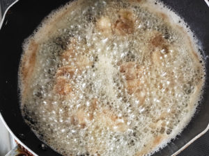 ![]() 6:フライパンに、醤油、みりん、カンタン酢、ゴマを入れて中火にかけ、調味料を溶かしましょう。 |